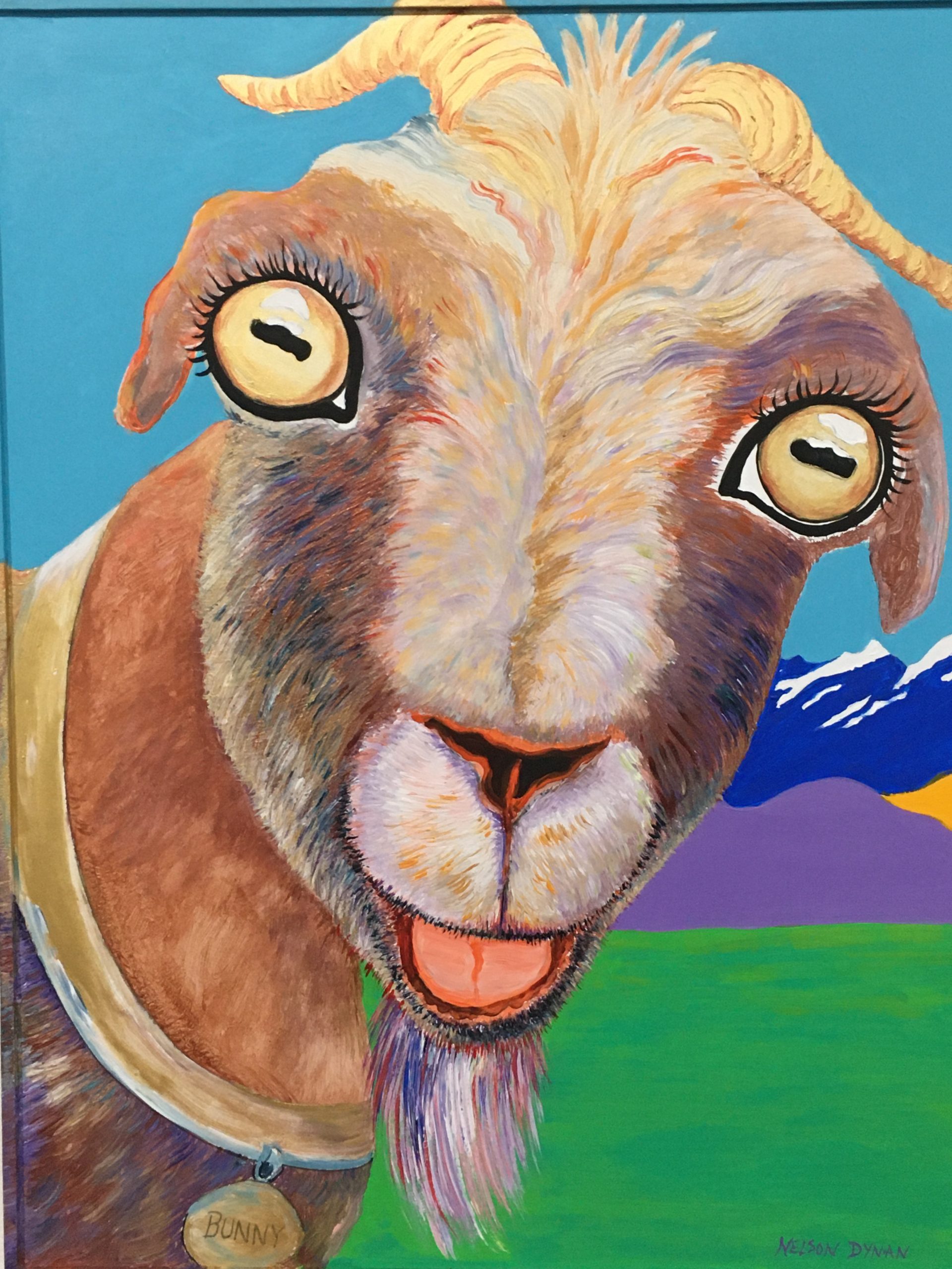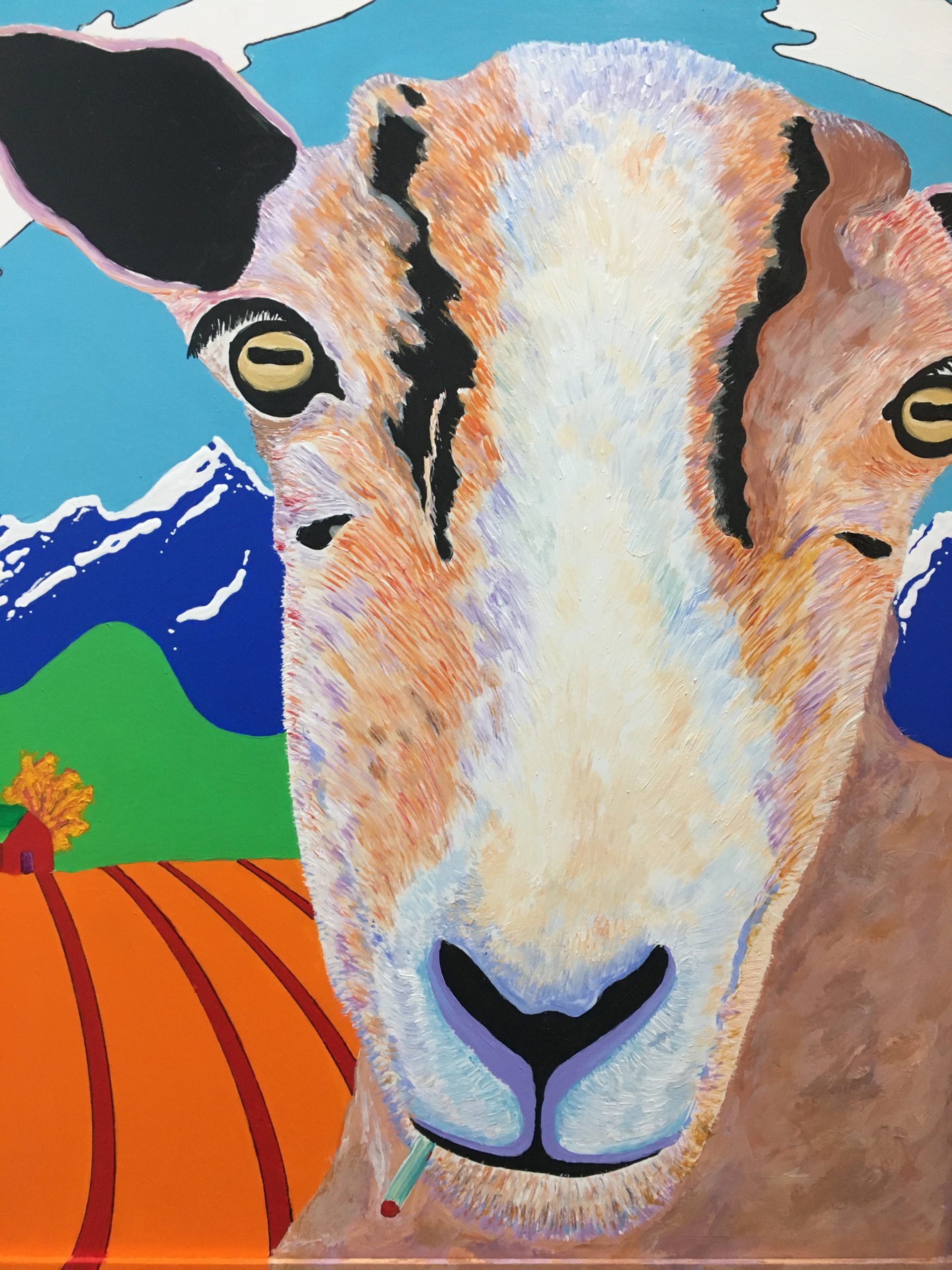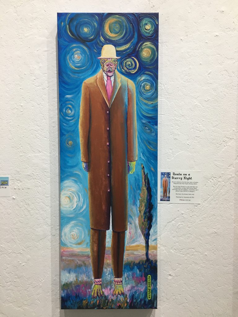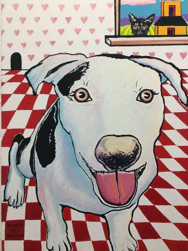 All of the art in the exhibit is related to the Rescue Center that the two artists have had for the past ten years. Portraits include goats, dogs, cats, cows, a donkey, a llama, chickens and other animals.