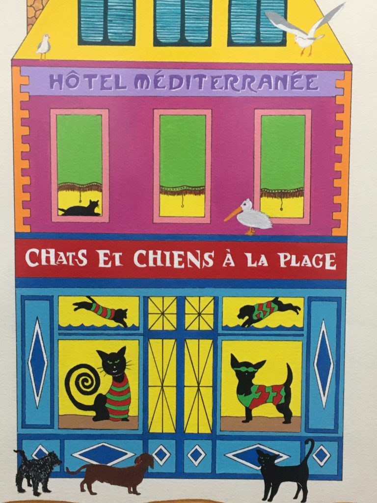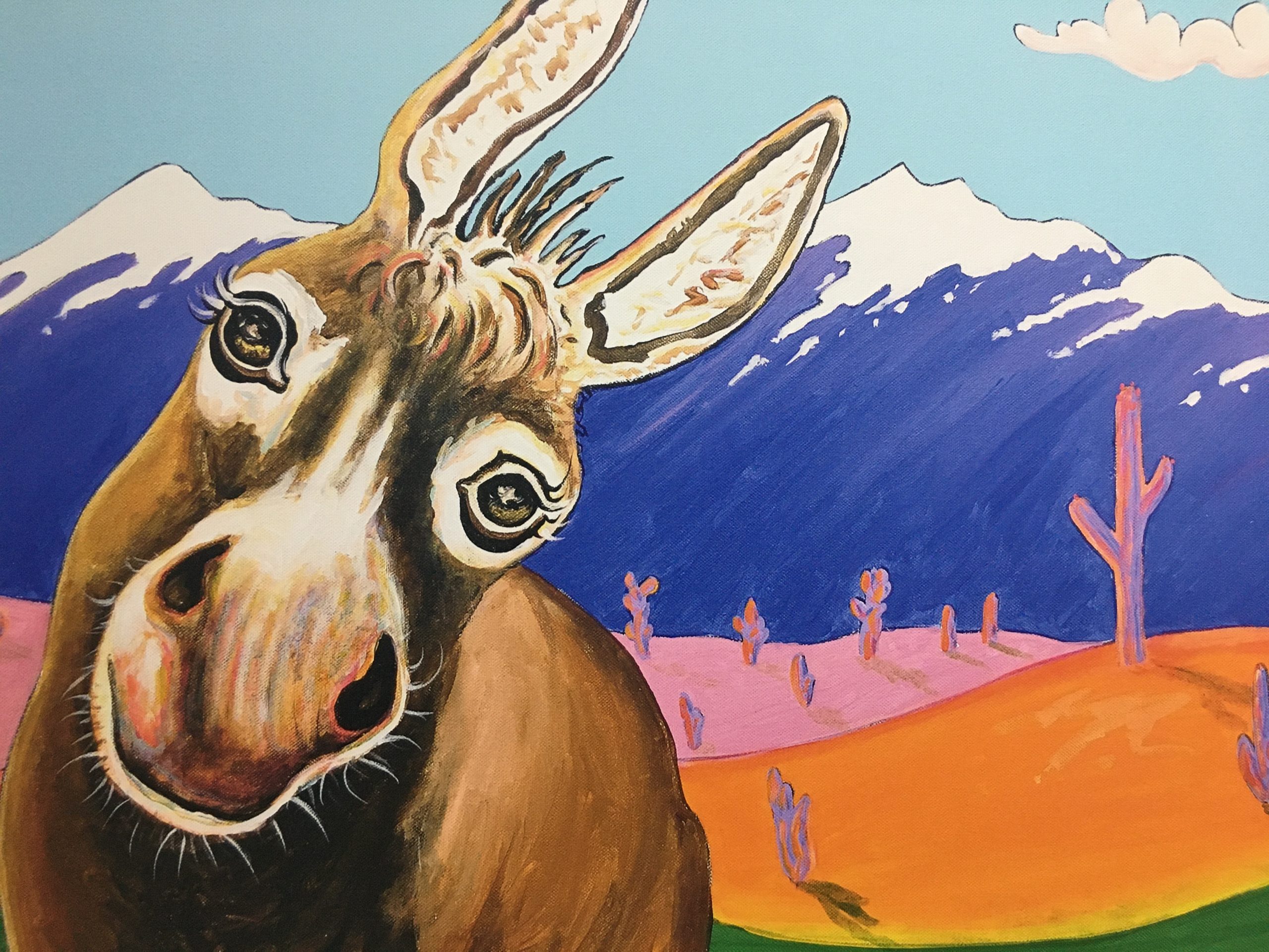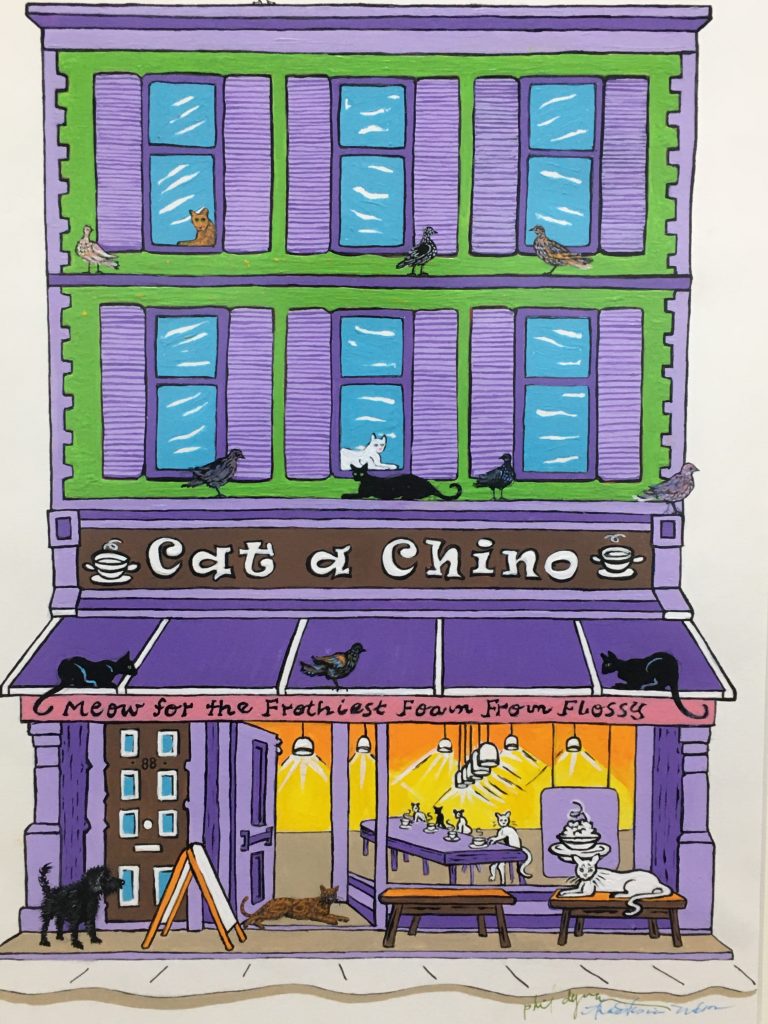 To support the animals (food and vet bills) the two artists started painting pictures of the animals. It proved to be very successful and popular and they expanded into selling notecards as well. There is a section within the exhibit where people can pick out a card or print with their favorite animal. Proceeds from the exhibit will go to the artists' Accidental Animal Rescue Center.